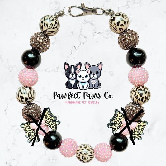 Wild Girly* Pink, Black & Brown Sparkle Leopard Bow Valentines Day Custom Beaded Dog/Cat Necklace!